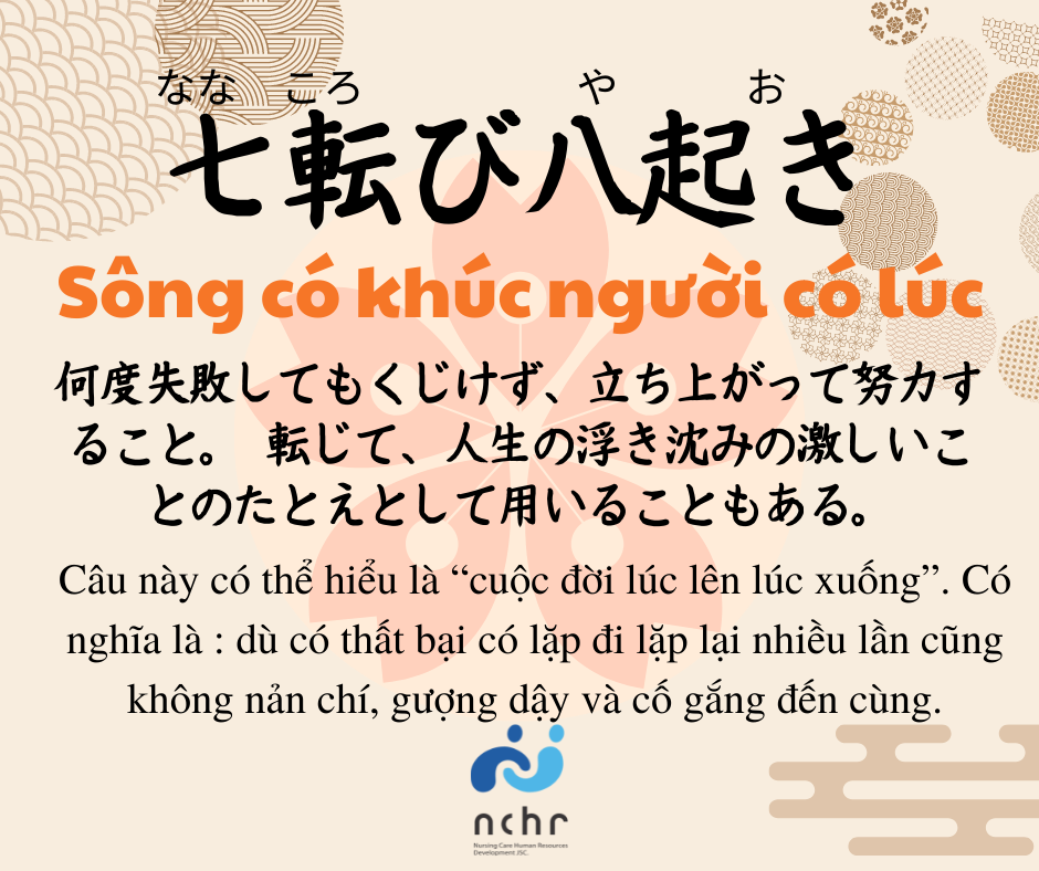 なな(7), ころび(ngã), や(số tám), おき(dậy); “7 lần ngã 8 lần đứng dậy”.