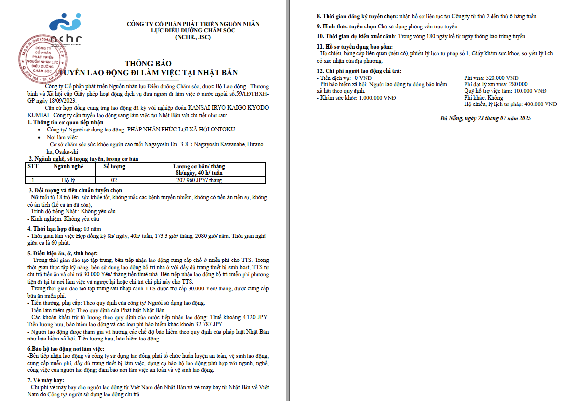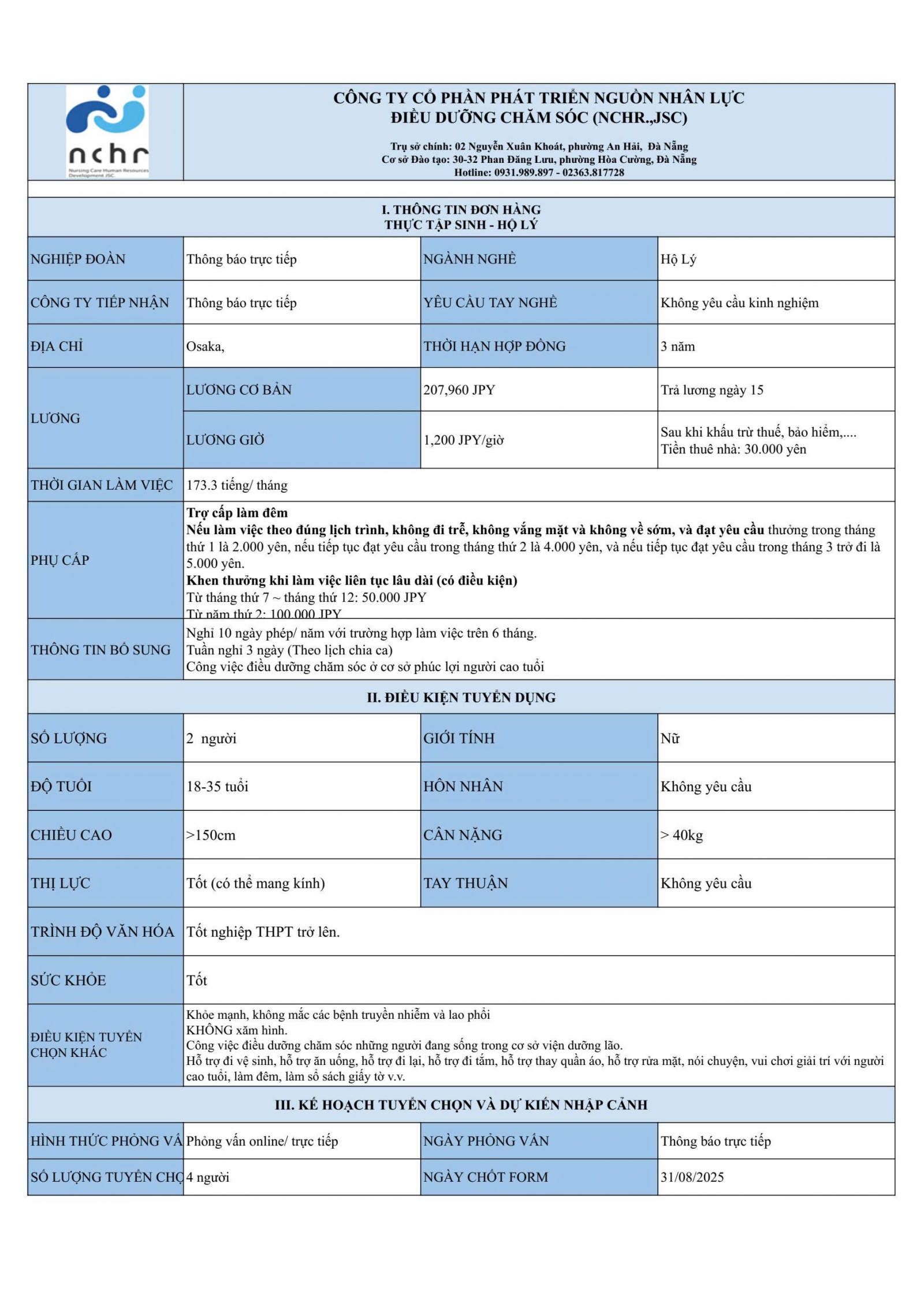 ĐƠN HÀNG THỰC TẬP SINH NGÀNH HỘ LÝ - OSAKA THÁNG 7/2025